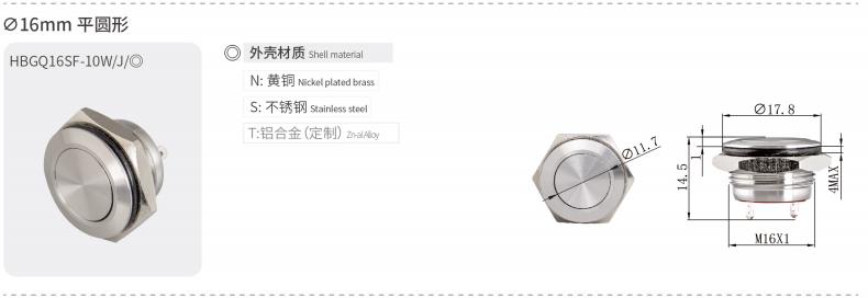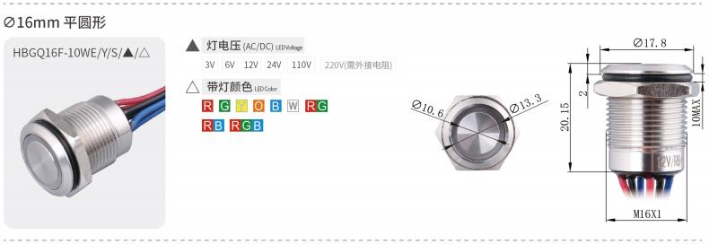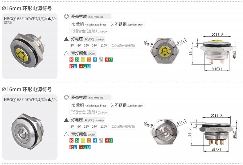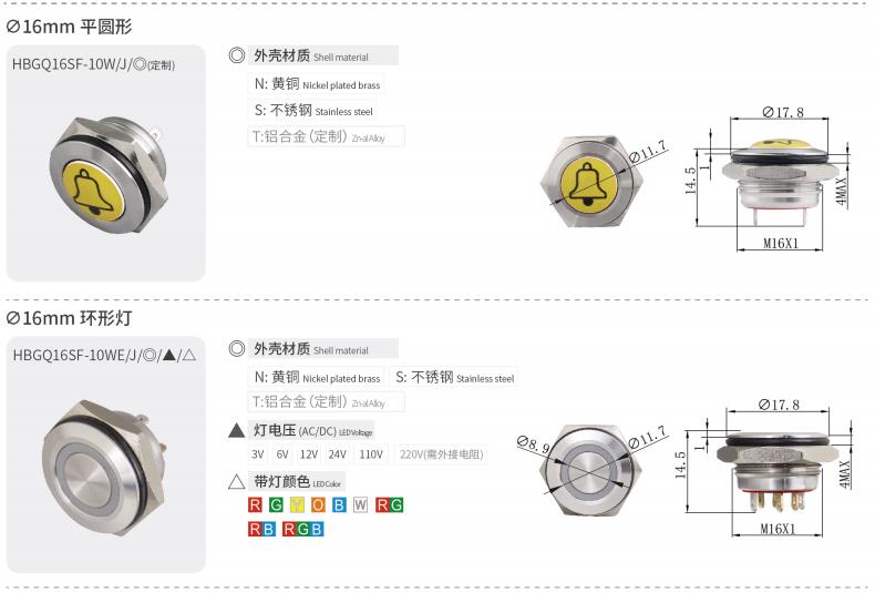 HBGQ系列微行程金属按钮安装孔径涵盖Φ10、Φ12、Φ16、Φ19、Φ22、Φ25、Φ30mm,产品内置优质轻触开关,手感回馈明显,按压声音清脆,开关性能稳定。带灯部分使用无极LED贴片灯珠(接线无正负极区分),亮度高且寿命长,是小型电器的首选开关。