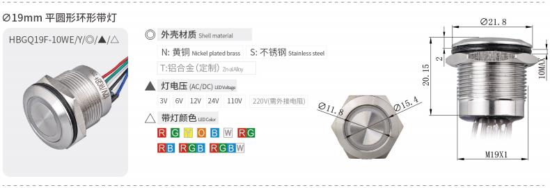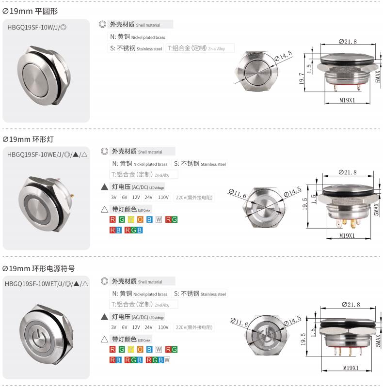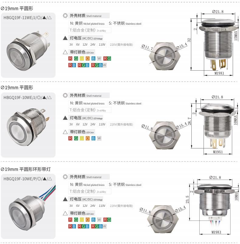 HBGQ系列微行程金属按钮安装孔径涵盖Φ10、Φ12、Φ16、Φ19、Φ22、Φ25、Φ30mm,产品内置优质轻触开关,手感回馈明显,按压声音清脆,开关性能稳定。带灯部分使用无极LED贴片灯珠(接线无正负极区分),亮度高且寿命长,是小型电器的首选开关。