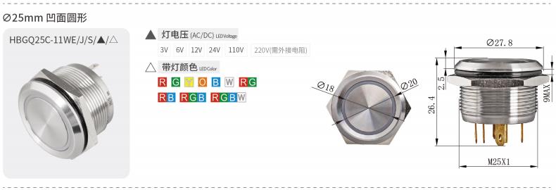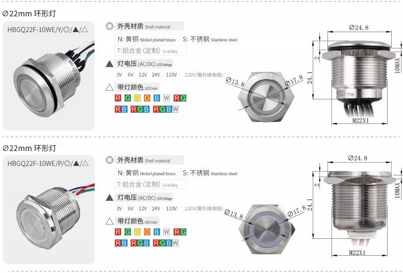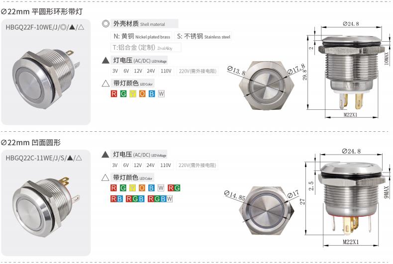 HBGQ系列微行程金属按钮安装孔径涵盖Φ10、Φ12、Φ16、Φ19、Φ22、Φ25、Φ30mm,产品内置优质轻触开关,手感回馈明显,按压声音清脆,开关性能稳定。带灯部分使用无极LED贴片灯珠(接线无正负极区分),亮度高且寿命长,是小型电器的首选开关。