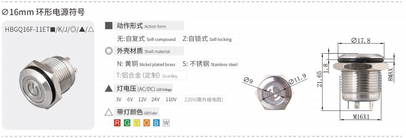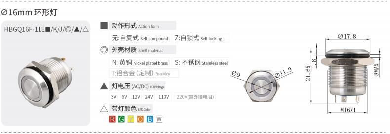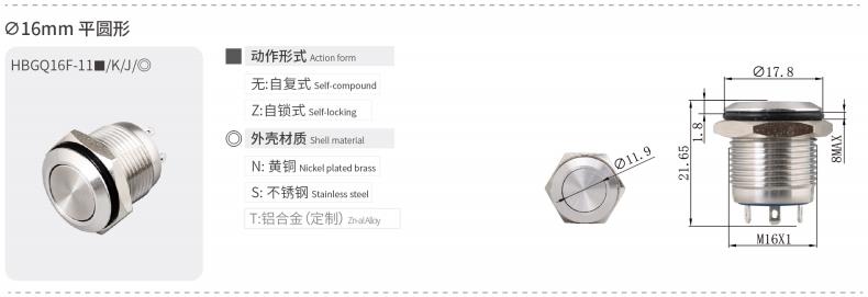 HBGQ系列微行程金属按钮安装孔径涵盖Φ10、Φ12、Φ16、Φ19、Φ22、Φ25、Φ30mm,产品内置优质轻触开关,手感回馈明显,按压声音清脆,开关性能稳定。带灯部分使用无极LED贴片灯珠(接线无正负极区分),亮度高且寿命长,是小型电器的首选开关。