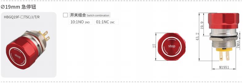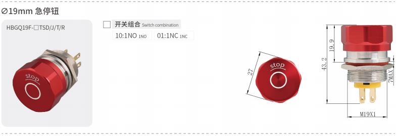 HBGQ19mm系列安装孔径为Φ19mm,开关为“自复|慢动|单刀单掷”。产品样式丰富,体积小巧,经济实用,一直是小型化面板用户的首选产品。产品防护等级可达IP65/IK08。