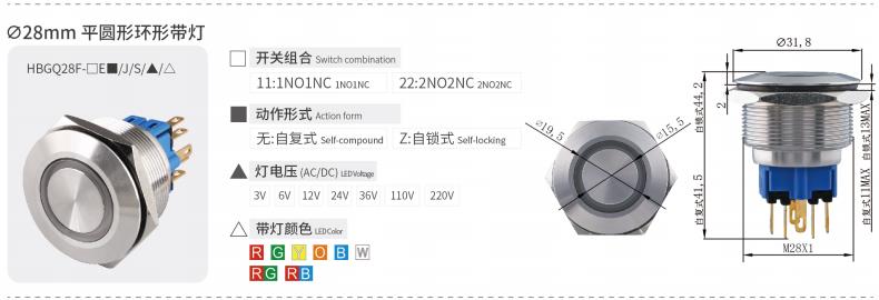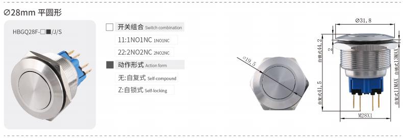 HBGQ系列安装孔径为Φ28mm,开关为“快动|单刀双掷”。产品外观大气时尚,配置丰富多样,性能稳定可靠。该系列自锁装置为“齿轮咬合”结构,自锁性能十分牢靠。产品防护等级可达IP65/IK10。