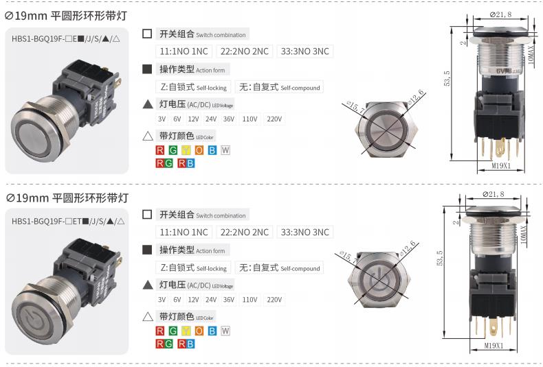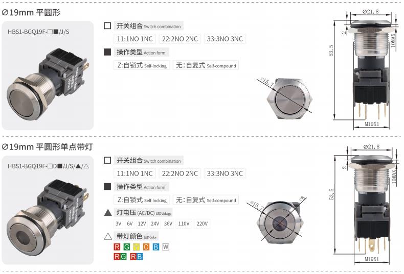 HBS1-BGQ系列安装孔径为Φ19mm,开关为“快动|单刀双掷/双刀双掷/三刀双掷”。该系列涵盖按钮、推锁旋放钮、旋钮、钥匙钮,且每只产品可配置1~3个开关元件,可满足用户多种需求。产品防护等级可达IP67/IK08。