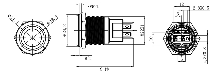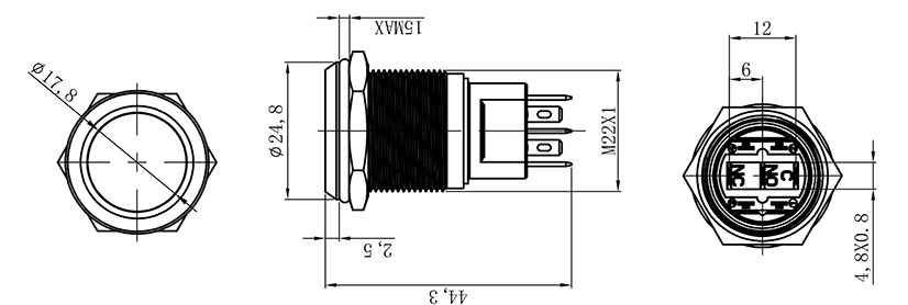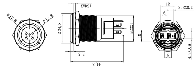![]() | HBS1-D22F-11E/■ | 安装孔尺寸:Ø22mm 头部形状:平圆形 开关组合:2NO 操作类型:自锁式/自复式 防护等级:IP65 | ![]() |